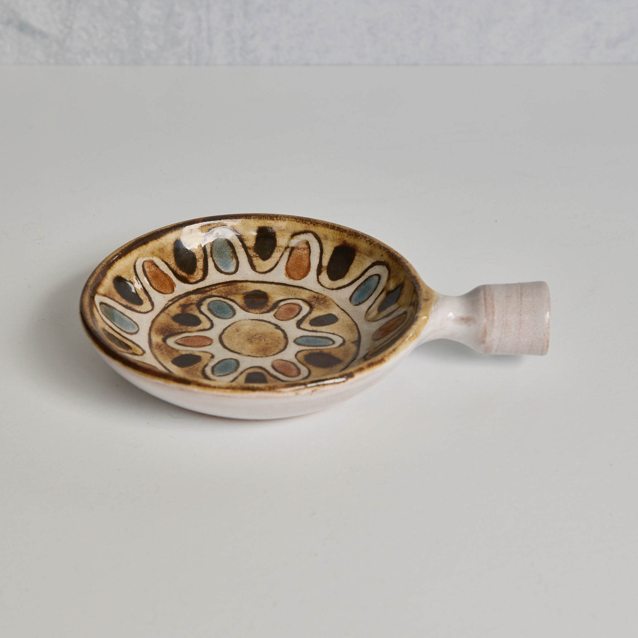 Jean-Claude Malarmey (1932-1992) was a French studio potter who was part of a community of artists (Capron, Picasso, and others) in Vallauris, France. He opened his own workshop in the late 1950s. His work is wheel thrown and hand painted. Mid-century modern with organic restraint.